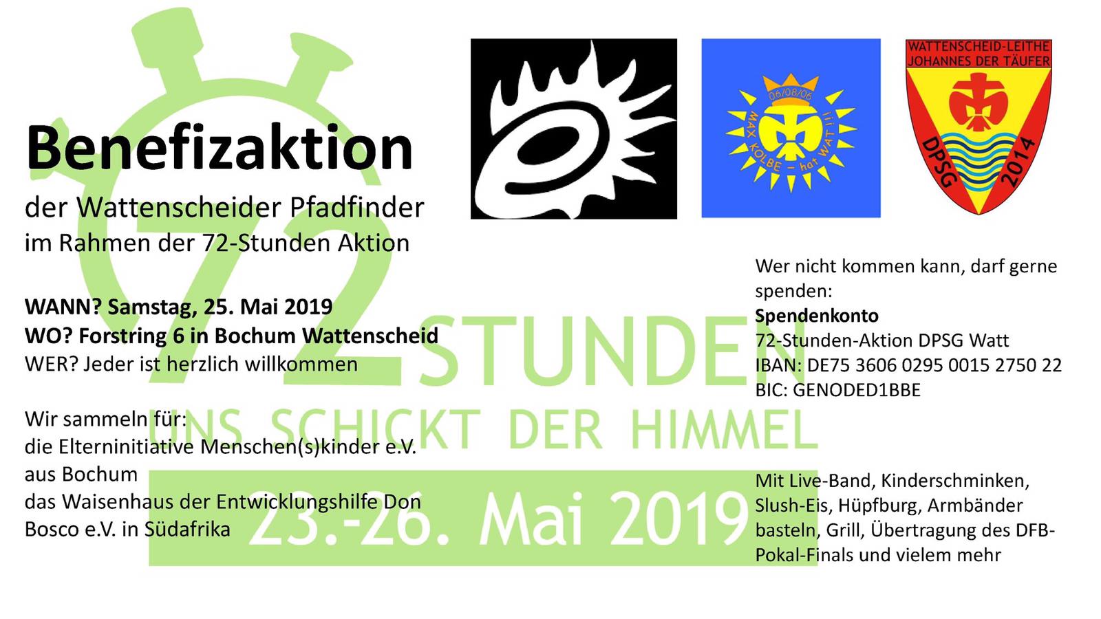 Im Rahmen der 72-Stunden Aktion organisierten die Wattenscheider Pfadfinder am 25. Mai an der Marienkirche in Bochum-Wattenscheid ein großes Fest mit Kinderattraktionen, der Übertragung des DFB-Pokal-Finals und kullinarischen Köstlichkeiten.