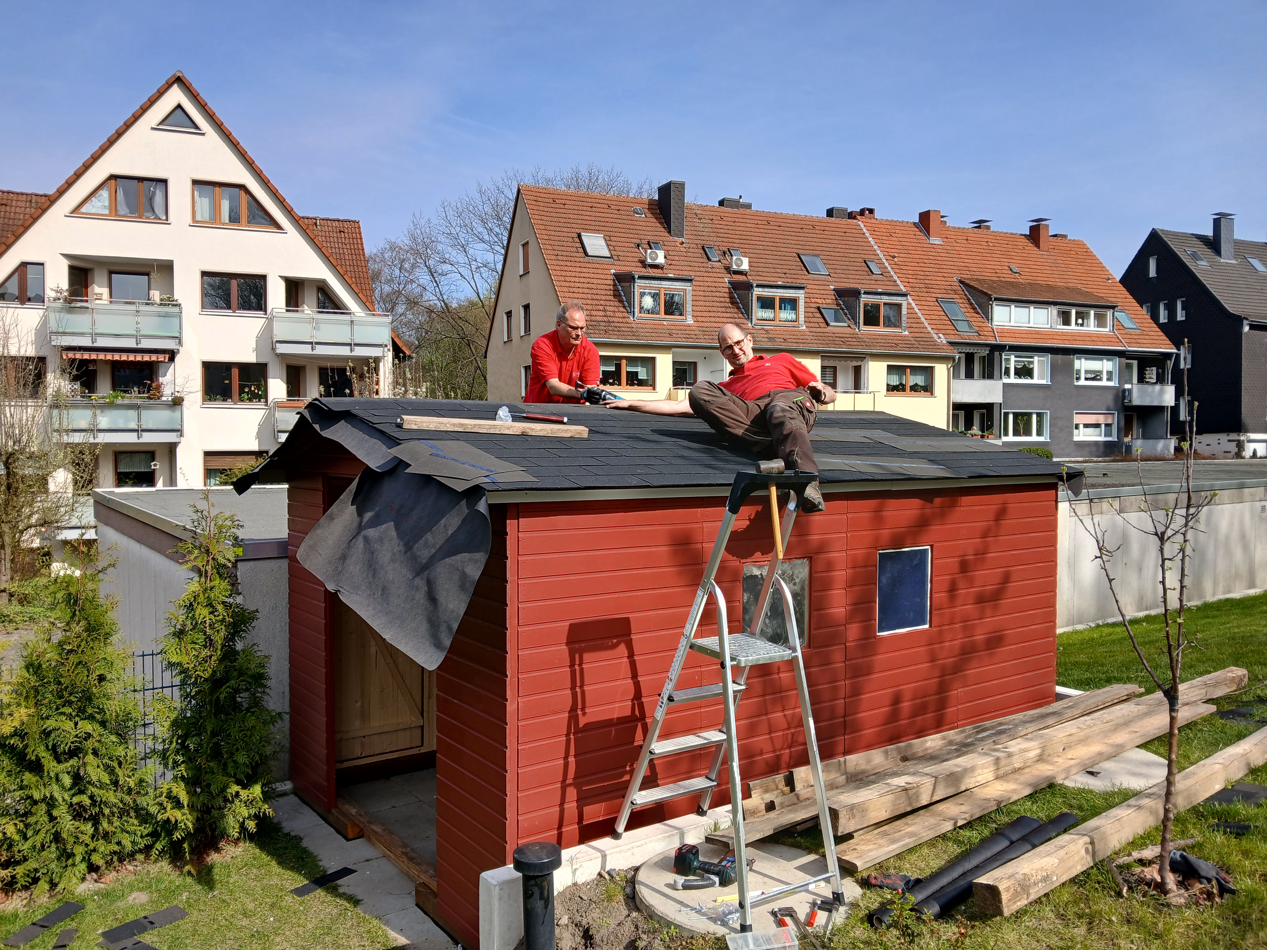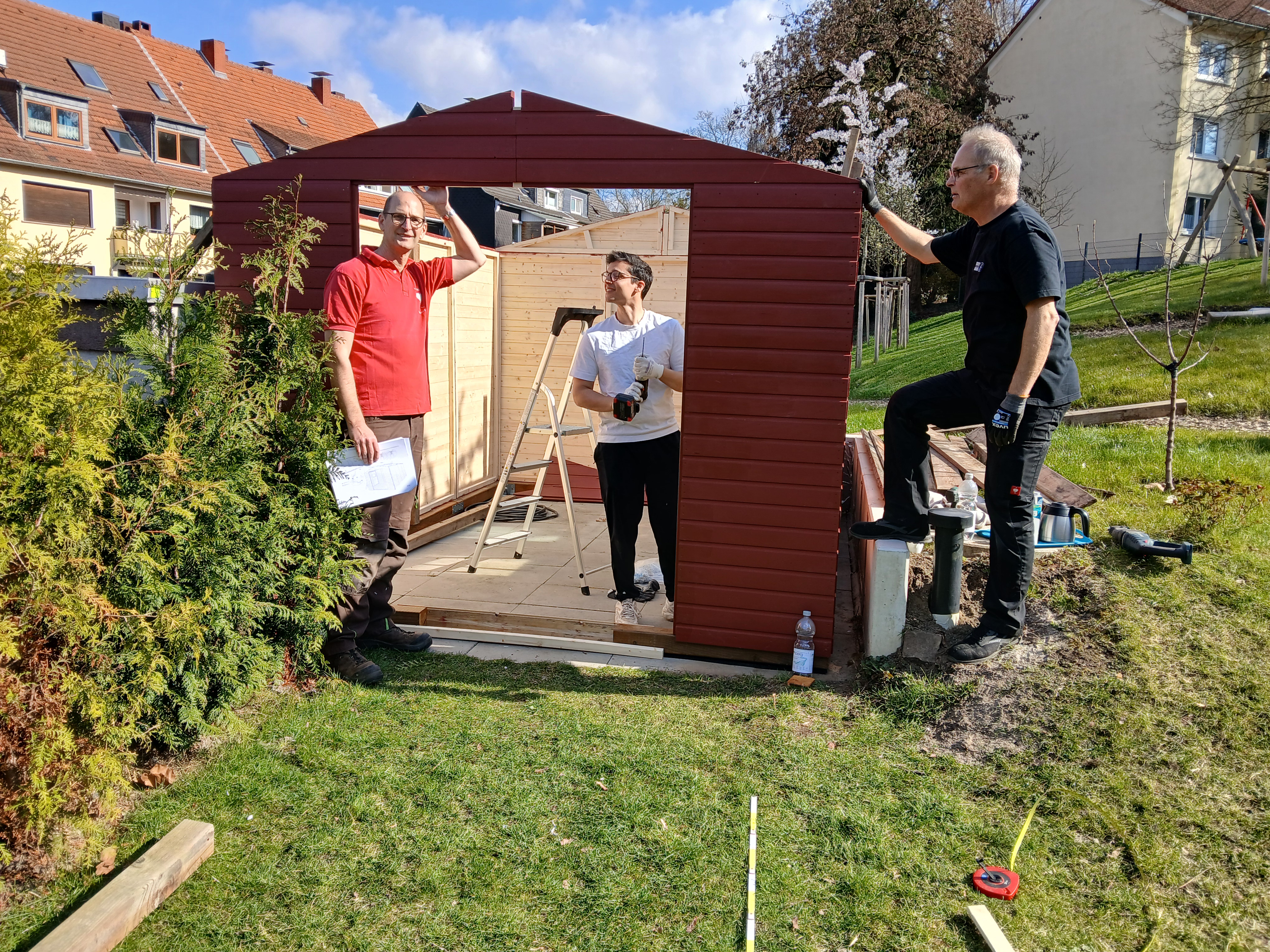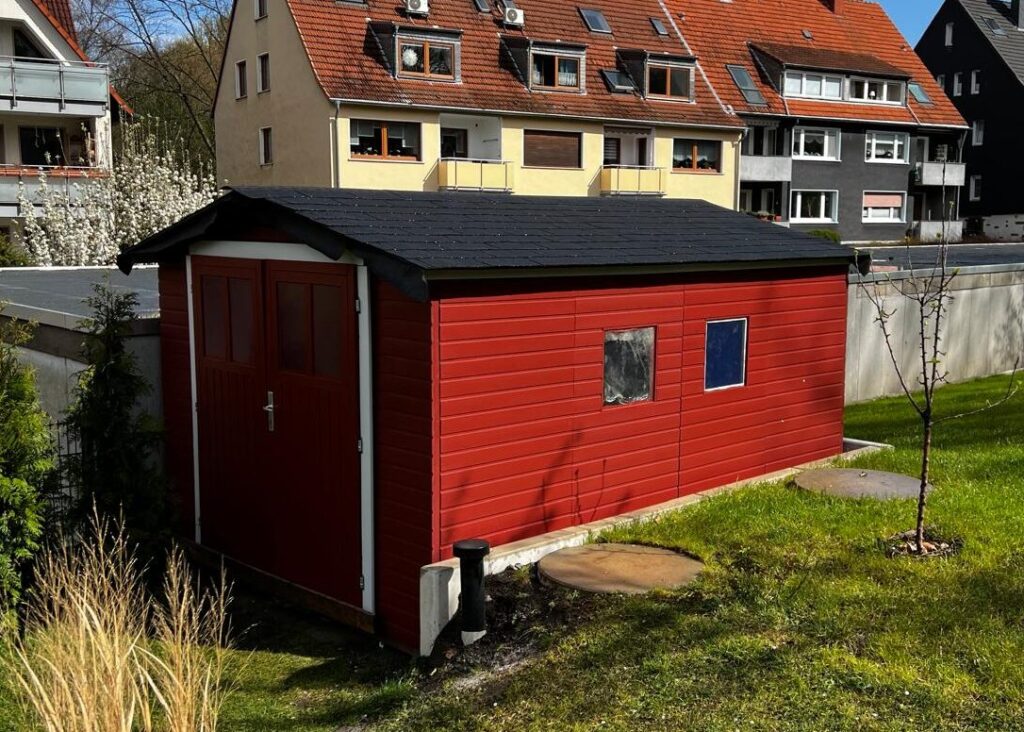 Nach einiger Vorbereitungszeit ensteht jetzt ein schwedenrotes Gartenhaus auf dem Gelände. Es ist notwendig, um Gartenmöbel, Spielsachen und Gerätschaften draußen zu lagern.