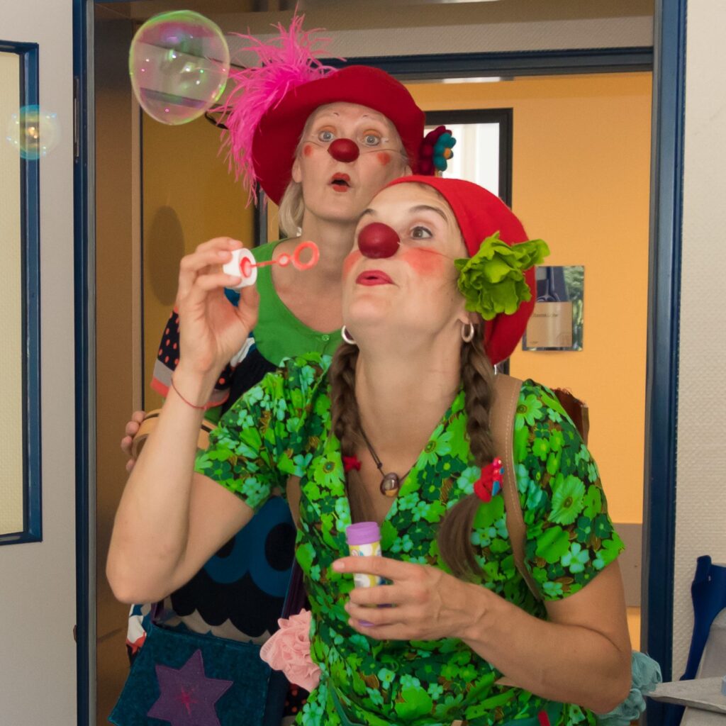Nach einer langen Corona-Spielpause ist es seit Anfang Juli für die Clowns sehr schön, den Kindern und Eltern endlich wieder Freude zu bringen. Auf den Stationen, wo es möglich war, haben sie vom Balkon aus und im Erdgeschoss draußen vor den Fenstern gespielt.